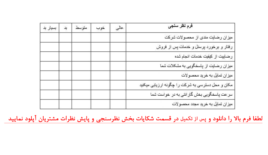 درقسمت آنلاین نظر سنجی 1 کمترین و5 بیشترین می باشد نظرات شما باعث پیشرفت ما در زمینه رشد شرکت می باشد ما را همیاری بفرمایید