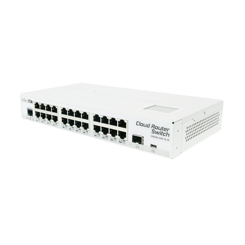 24x Gigabit Ethernet layer 3 Smart Switch, 1x SFP cage, LCD, 600MHz CPU, 128MB RAM, Metal desktop case, RouterOS L5